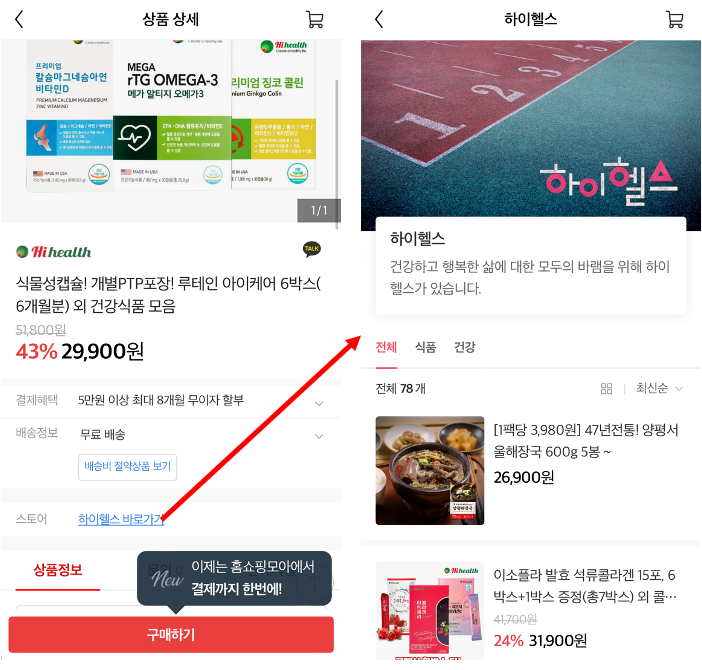 이제 바로결제 상품의 상세 페이지를 살펴보자. 상세 페이지에 진입하면 일반 상품과 달리 상품 찜하기 버튼이 존재하지 않는다. 또한, 브랜드관이 아닌 스토어로 이동할 수 있는 버튼이 존재한다는 점도 차이가 있다. [하이헬스 바로가기] 버튼을 클릭하면 하이헬스 스토어로 이동한다. 홈쇼핑모아에 입점한 판매자가 운영하는 하이헬스 스토어의 상품을 모아둔 것이라고 할 수 있다. 스토어 페이지에서도 스토어 좋아요 버튼이 존재하지 않는다.