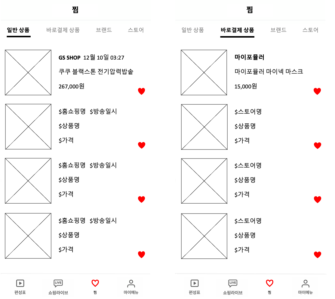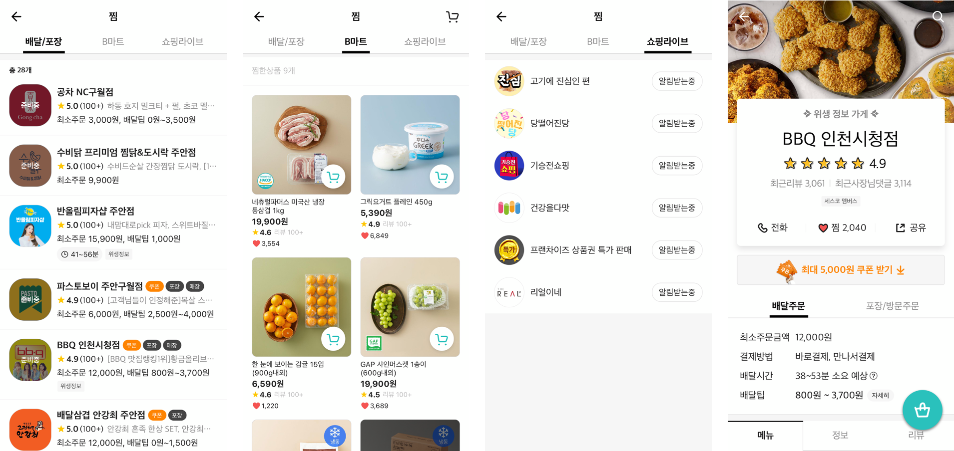 [배달/포장] 탭에는 찜한 가게 리스트가 노출되고 클릭 시 해당하는 가게 메인 페이지로 이동하게 된다. 좋아하는 가게 리스트를 저장해두어 재주문을 유발할 수 있는 효과를 가져온다. [B마트] 탭에는 찜해둔 상품의 리스트가 노출된다. 일시 품절된 상품의 상태도 나타나기 때문에 재고가 풀리는 것을 확인할 수 있다. [쇼핑라이브] 탭에는 예약한 라이브커머스 리스트가 노출되어 알림 상태를 확인할 수도 있고 해제할 수도 있다.