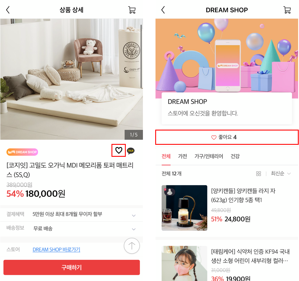 바로결제 상품 좋아요 클릭 시, [찜 - 바로결제 상품] 탭 리스트에 추가된다. 스토어 좋아요 클릭 시, [찜 - 스토어] 탭 리스트에 추가된다.