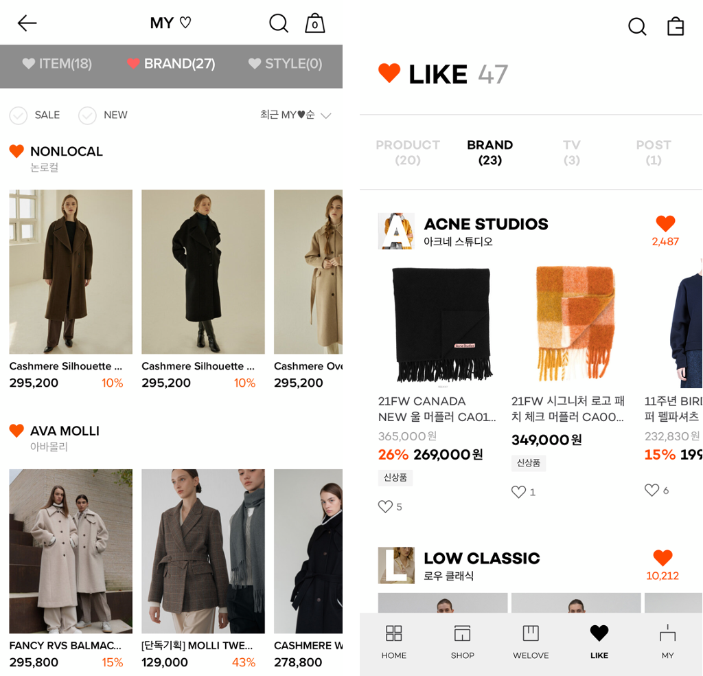 W컨셉과 29CM의 [찜 - 브랜드] 영역을 보면 찜한 브랜드와 함께 신상품을 일부 보여줌으로써 브랜드 상세 페이지에 진입하지 않더라도 애정 하는 브랜드의 신상품을 바로 확인할 수 있도록 피드처럼 보여주고 있다.