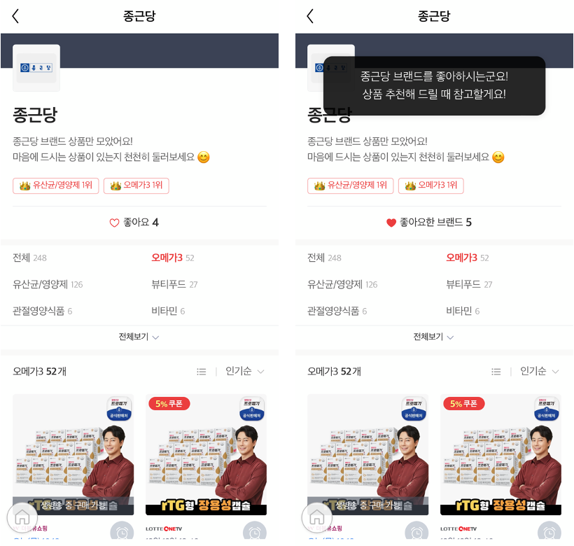 위에서 살펴본 종근당 브랜드관을 좀 더 살펴보자. 브랜드 [좋아요] 버튼을 누르면 상품 추천에 참고한다는 토스트 팝업이 뜬다. 좋아요한 브랜드를 모아둔 곳을 볼 수 있는지 앱을 여기저기 살펴보았지만 구현되어있지 않은 것 같았다. 아직까지는 상품 추천에만 활용되고 있는 것으로 보인다. 따라서 현재 프론트에서 사용자가 찜한 목록을 볼 수 있는 것은 일반 상품뿐이다.