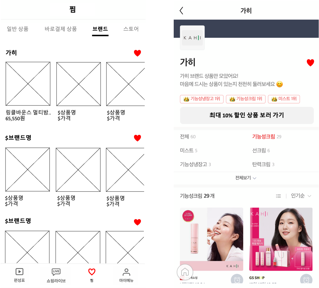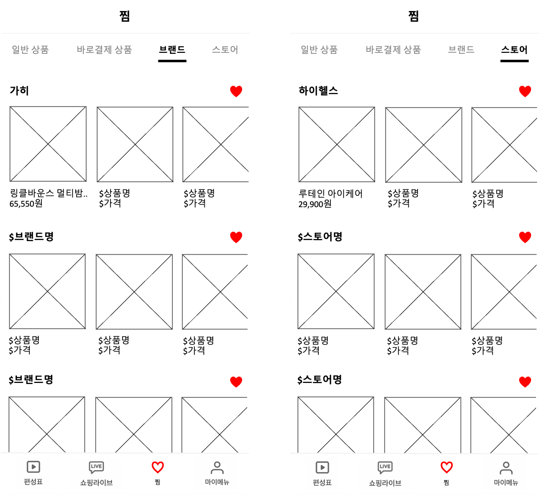 하단 네비게이션에 찜 메뉴를 새로 만들어서 찜한 상품(일반, 바로결제), 브랜드, 스토어 목록을 한 번에 보여줄 수 있다면 어떨까? 찜한 상품을 쉽게 확인할 수 있고, 브랜드나 스토어 피드를 한 번에 모아봄으로써 지속적인 유입 효과를 가져올 수 있을 것이다. 또한, 내가 좋아요한 브랜드나 스토어의 새로운 상품을 보여주거나 브랜드 할인 쿠폰을 발행하여 구매 전환율을 높일 수 있으며 이는 지속적인 판매자(셀러) 유입 효과를 가져올 것이다.