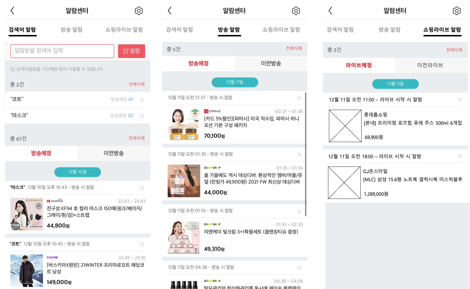 알람센터를 검색어 알람, 방송 알람, 쇼핑라이브 알람 세 가지 탭으로 분리한다.