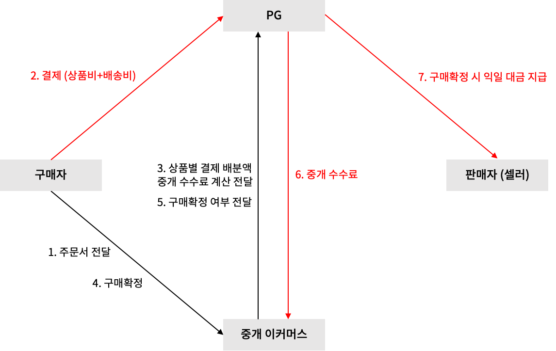 [통신판매업자 = 종합몰]은 결제가 이루어지면 카드사로부터 직접 돈을 받으면 된다. 하지만 [통신판매중개업자 = 오픈마켓]은 결제가 이루어지면 에스크로 서비스가 필요하기 때문에 꼭 PG사를 끼고 있게 된다. 따라서, 이러한 부분이 시스템에 반영되어야 한다.