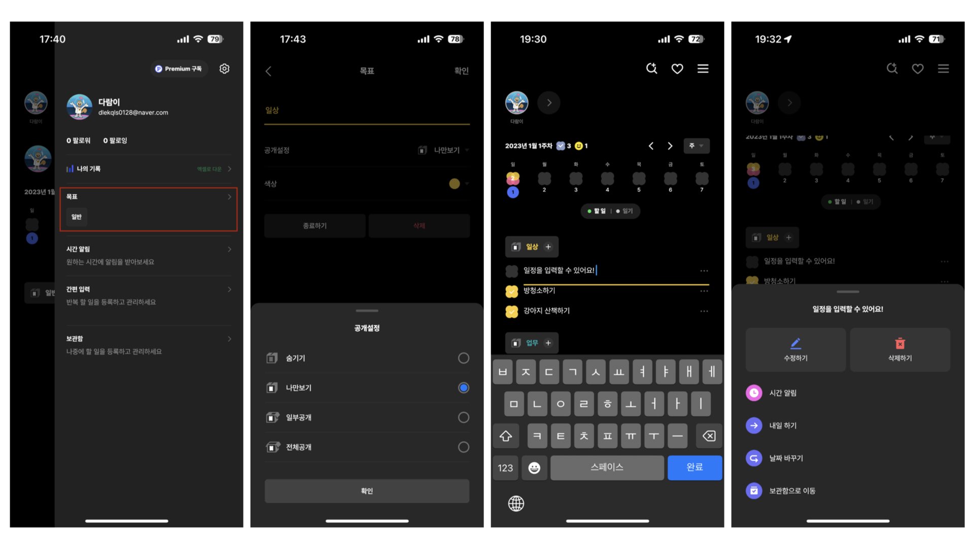 카테고리가 설정되었다면 홈에서 [+] 버튼을 통해 손쉽게 일정을 등록하고 수정할 수 있어요. 시간 알림을 설정하여 리마인드하거나 오늘 못다 한 일은 내일 하기, 날짜 바꾸기, 보관함으로 이동과 같은 기능을 이용하여 일정을 유동적으로 변경할 수도 있답니다.
